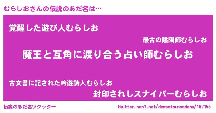 | 男性向けラノベタイトル風あだ名 | 『転生したらむらしおだった件』 |