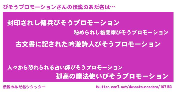 | 男性向けラノベタイトル風あだ名 | 『この素晴らしい世界にびそうプロモーションを!』 |