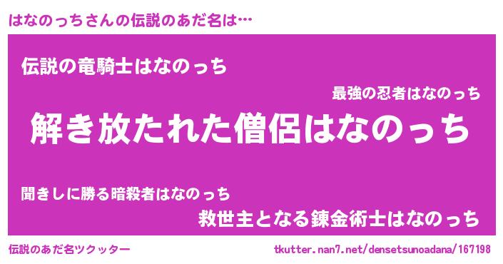 | 女子向けラノベタイトル風あだ名 | 『はなのっちの卵を拾いまして』 |