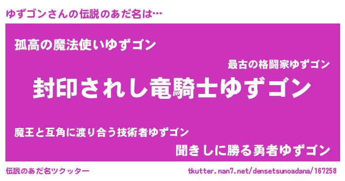 | 男性向けラノベタイトル風あだ名 | 『Re:ゆずゴンから始める異世界生活』 |