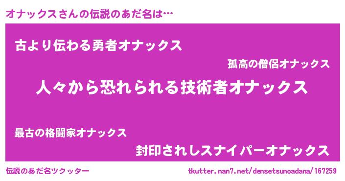 | 意味不明あだ名 | 『住所不定無職オナックス(5歳)』 |