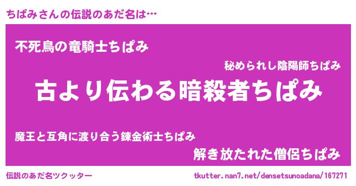 | 男性向けラノベタイトル風あだ名 | 『転生したらちぱみだった件』 |