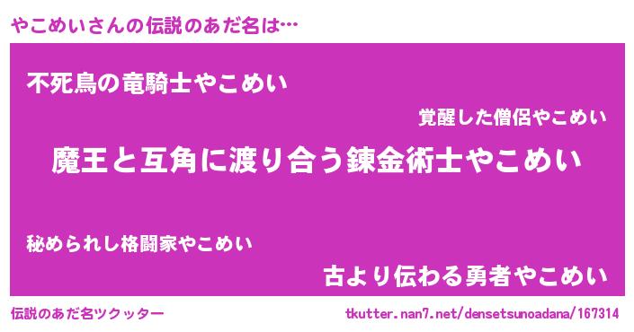 | ヒーロー風カッコイイあだ名 | 『愛の使者やこめい』『スーパーヤコメイ』 |