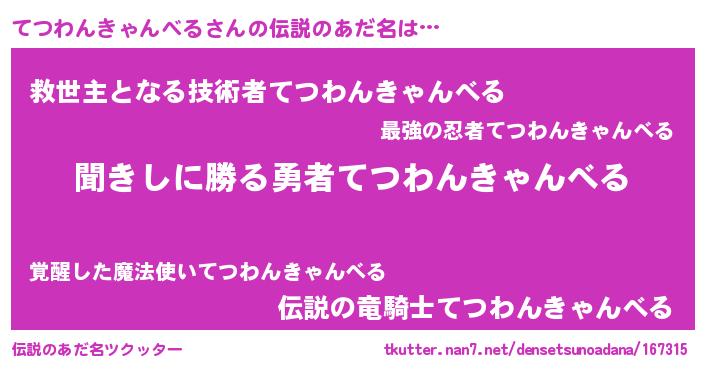 | 男性向けラノベタイトル風あだ名 | 『てつわんきゃんべるという概念が存在しない退屈な世界 』 |
