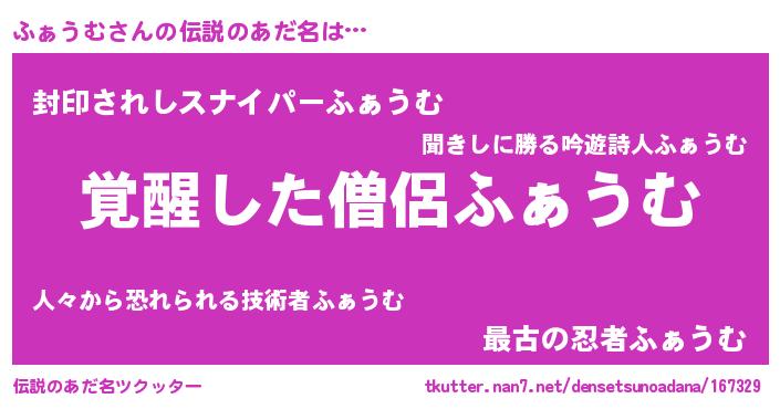 | 男性向けラノベタイトル風あだ名 | 『ふぁうむの嫁は女の子じゃないと思った?』 |