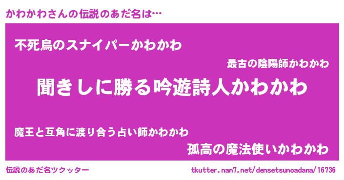 | 男性向けラノベタイトル風あだ名 | 『かわかわという概念が存在しない退屈な世界 』 |