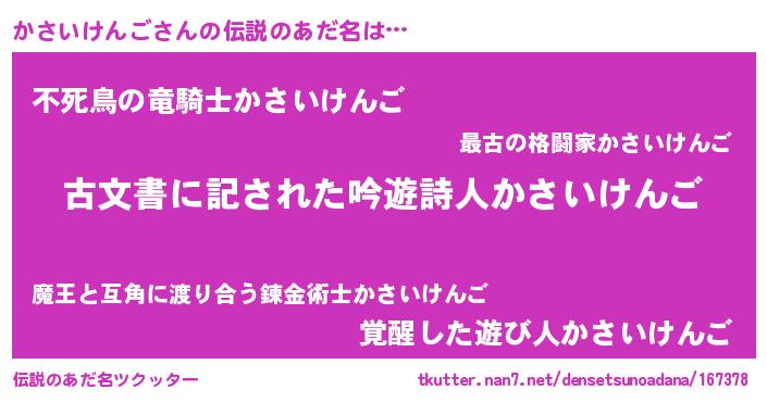 | 男性向けラノベタイトル風あだ名 | 『かさいけんご~年齢イコール彼女いない歴の魔法使い~』 |