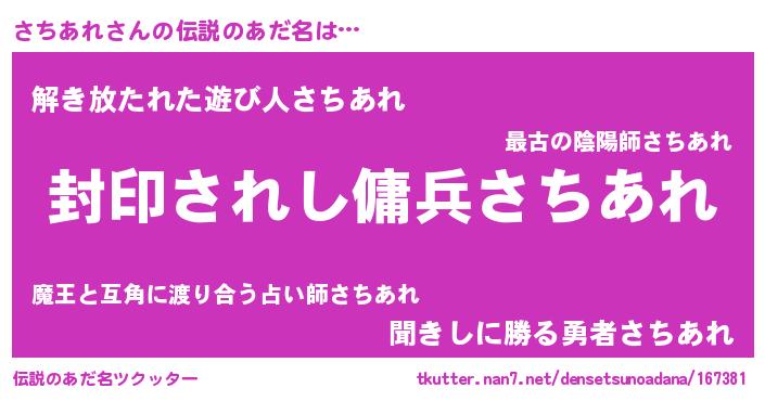 | ヒーロー風カッコイイあだ名 | 『スーパーサチアレ』『銀牙騎士サチ』 |