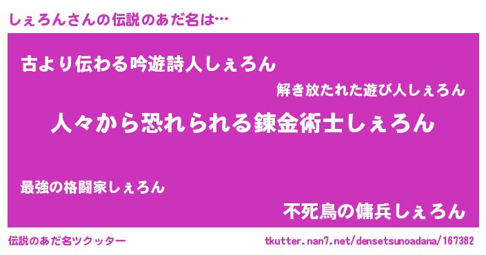 | 男性向けラノベタイトル風あだ名 | 『おまえをオタクにしてやるから、俺をしぇろんにしてくれ! 』 |