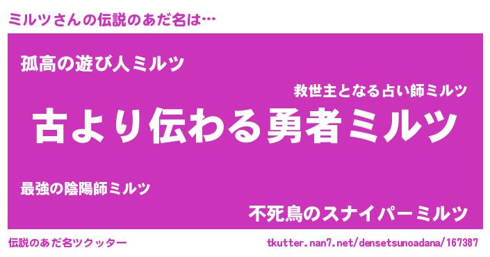 | 意味不明あだ名 | 『永久保存ミルツ』『自称ミルツ』 |