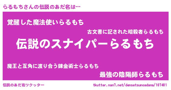 | 意味不明あだ名 | 『ペロリンらるもち』『自称らるもち』 |