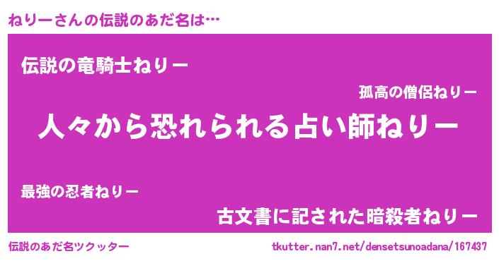 | 男性向けラノベタイトル風あだ名 | 『おまえをオタクにしてやるから、俺をねりーにしてくれ! 』 |
