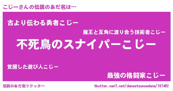 | 男性向けラノベタイトル風あだ名 | 『この素晴らしい世界にこじーを!』 |