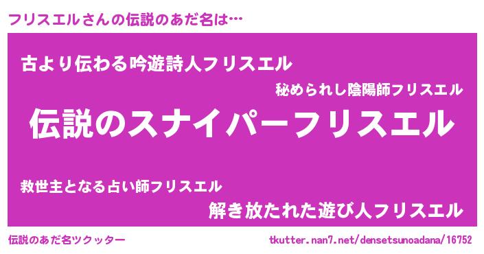 | 男性向けラノベタイトル風あだ名 | 『緋弾のフリスエル』『フリスエルの憂鬱』 |