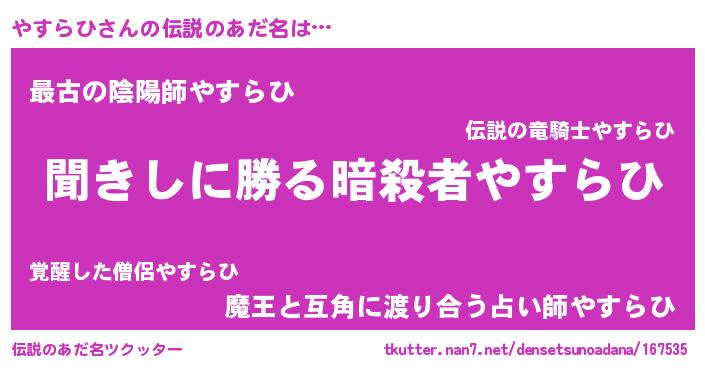 | ヘコむあだ名 | 『やすらひ(爆)』『牛乳』『やす太郎』 |