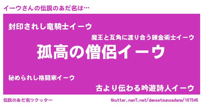 | 女子向けラノベタイトル風あだ名 | 『イーウは平凡を望む』『闇のイーウ』 |
