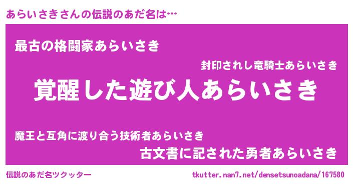 | 胡散臭い通販商品みたいなあだ名 | 『あなたにだけ特別に提供する世界で10本だけ現存している希少なブランデー…その名も「あらいさき」』 |