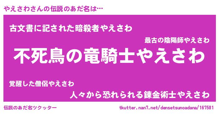 | 男性向けラノベタイトル風あだ名 | 『Re:やえさわから始める異世界生活』 |