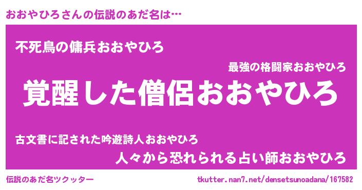 | 意味不明あだ名 | 『自称おおやひろ』『ペロリンおおやひろ』 |