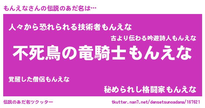 | 女子向けラノベタイトル風あだ名 | 『もんえな姫と円卓の騎士』 |