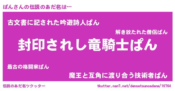 | 女子向けラノベタイトル風あだ名 | 『悪役ぱんに転生したようですが、知った事ではありません』 |