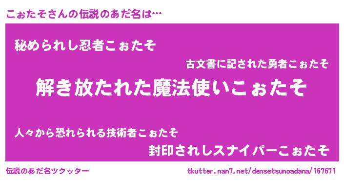 | ヒーロー風カッコイイあだ名 | 『魔戒騎士コォ』『ウルトラこぉたそマン』 |