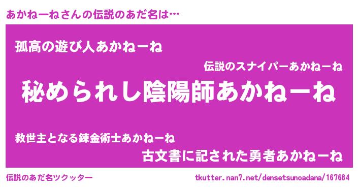 | 男性向けラノベタイトル風あだ名 | 『アカネーネスレイヤー』 |