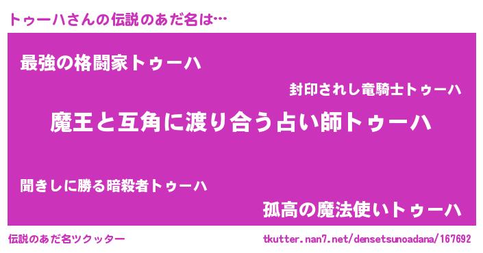 | ヒーロー風カッコイイあだ名 | 『仮面トゥダー』『天空の使者トゥーハ』 |