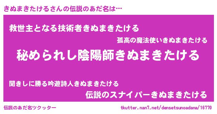 | 意味不明あだ名 | 『住所不定無職きぬまきたける(79歳)』 |