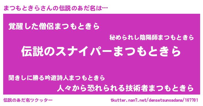 | 男性向けラノベタイトル風あだ名 | 『魔弾の王とまつもときら』 |