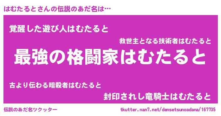 | 男性向けラノベタイトル風あだ名 | 『Re:はむたるとから始める異世界生活』 |