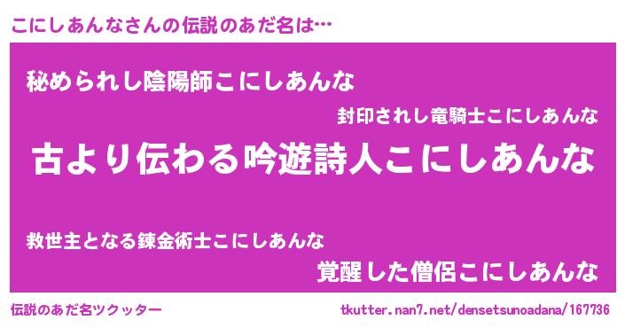 | 男性向けラノベタイトル風あだ名 | 『この素晴らしい世界にこにしあんなを!』 |