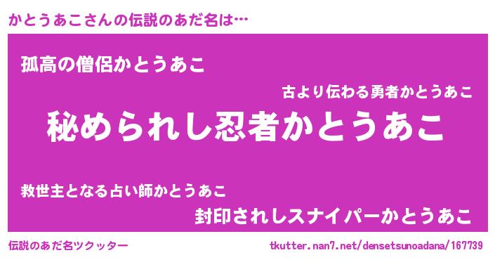 | 意味不明あだ名 | 『住所不定無職かとうあこ(40歳)』 |