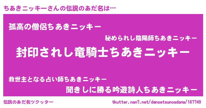 | 男性向けラノベタイトル風あだ名 | 『ちあきニッキー~年齢イコール彼女いない歴の魔法使い~』 |