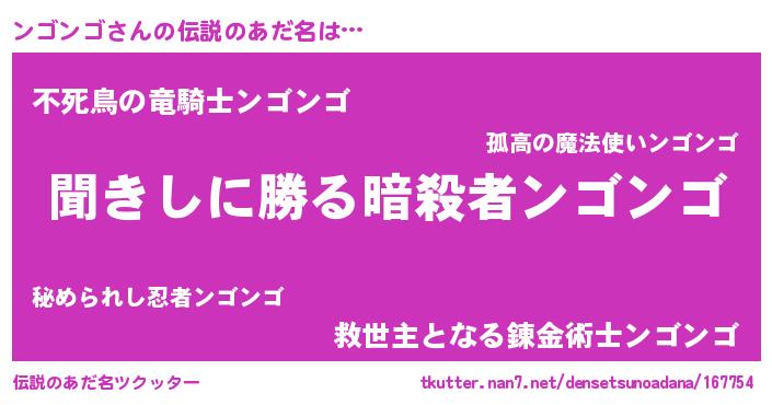 | 男性向けラノベタイトル風あだ名 | 『ンゴンゴスレイヤー』 |