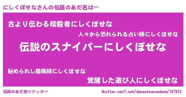 | 胡散臭い通販商品みたいなあだ名 | 『必ず成功する霊験あらたかなお札…その名も「にしくぼせな」』 |