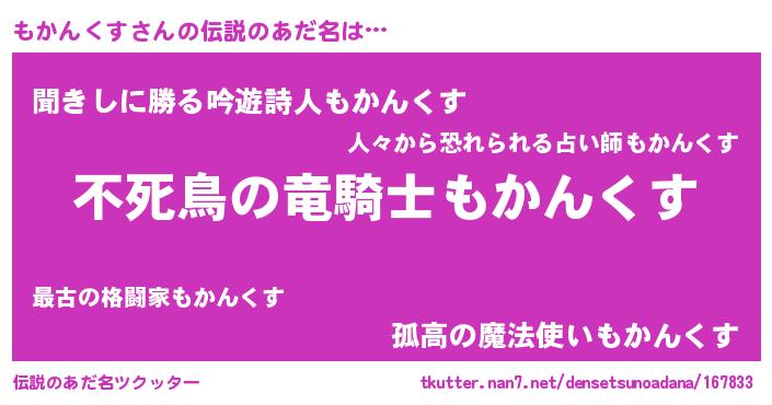 | 女子向けラノベタイトル風あだ名 | 『もかんくす姫と円卓の騎士』 |