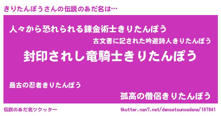 | 意味不明あだ名 | 『住所不定無職きりたんぽう(1歳)』 |