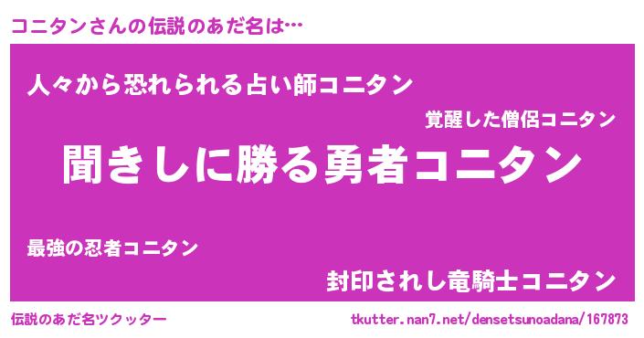 | 男性向けラノベタイトル風あだ名 | 『コニタンという概念が存在しない退屈な世界 』 |