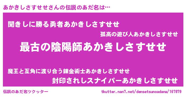 | 男性向けラノベタイトル風あだ名 | 『魔弾の王とあかきしさすせせ』 |