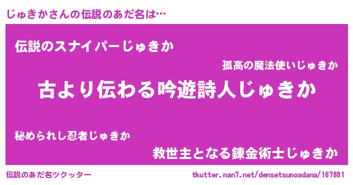 | 女子向けラノベタイトル風あだ名 | 『じゅきかの契約王妃』『じゅきか恋絵巻』 |