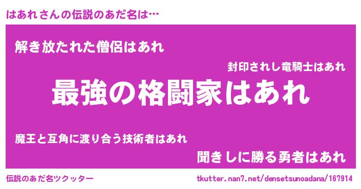 | 胡散臭い通販商品みたいなあだ名 | 『あなたにだけ特別に提供する100年もののヴィンテージワイン…その名も「はあれ」』 |