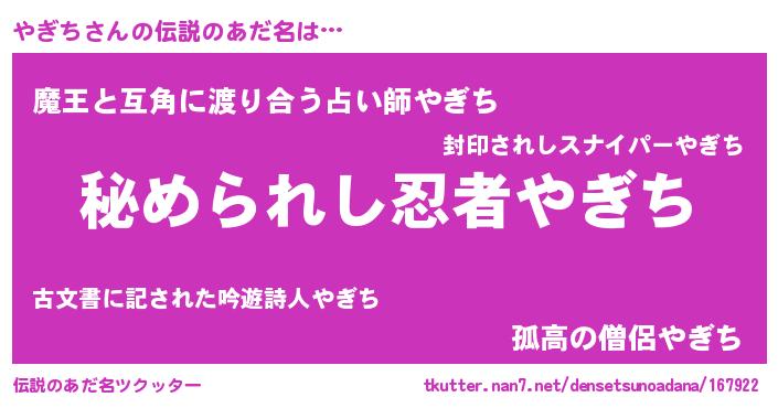 | 意味不明あだ名 | 『やぎちフォーエバー』『自称やぎち』 |