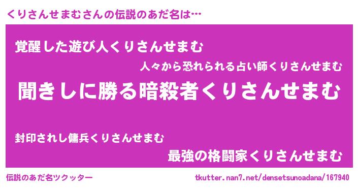 | 男性向けラノベタイトル風あだ名 | 『くりさんせまむという概念が存在しない退屈な世界 』 |