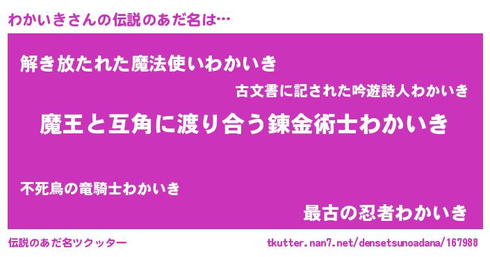 | 意味不明あだ名 | 『住所不定無職わかいき(77歳)』 |