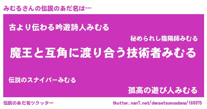 | ヒーロー風カッコイイあだ名 | 『慈愛の使者みむる』『ネオミムル』 |