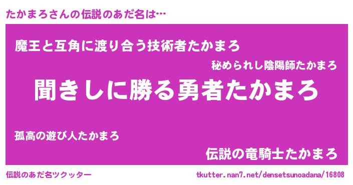 | 女子向けラノベタイトル風あだ名 | 『異世界で失敗しない100のたかまろ』 |