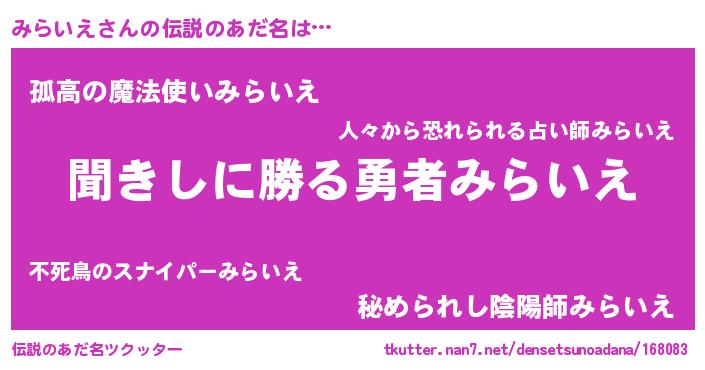 ヘコむあだ名 | 『みらいえ(遠い目)』『みら太郎』 |