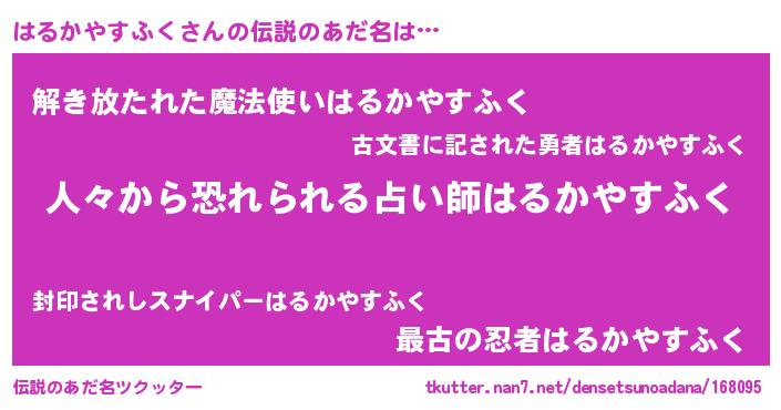 | 男性向けラノベタイトル風あだ名 | 『ハルカヤスフクスレイヤー』 |
