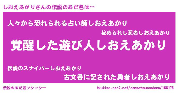 | 男性向けラノベタイトル風あだ名 | 『しおえあかりの嫁は女の子じゃないと思った?』 |